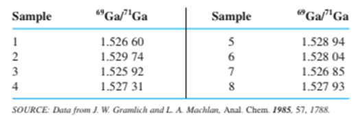 The ratio of the number of atoms of the isotopes andin eight samples from different sources was measured in an effort to understand differences in reported values of the atomic mass of gallium: