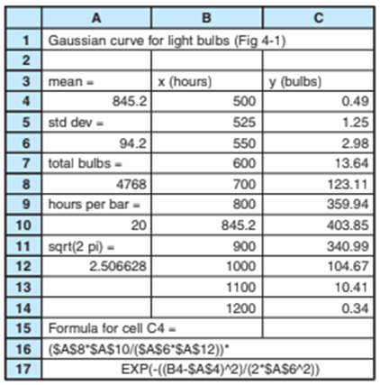 where is the mean value is the standard deviation , total bulbs = 4768, and hours per bar ( = 20) is the width of each bar in Figure 4 - 1. Set up a spreadsheet like the one with this problem to calculate the coordinates of the Gaussian curve in Figure 4 - 1 from 500to 1200hin 25 - hintervals. Note the heavy use of parentheses in the formula at the bottom of the spreadsheet to force the computer to do the arithmetic as intended. Use Excel to graph your results.