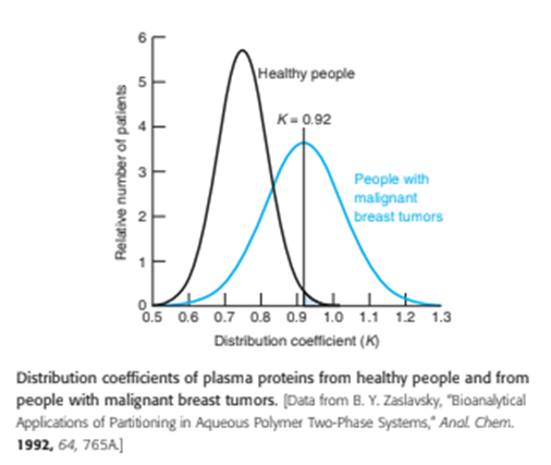 Blood plasma proteins of patients with malignant breast tumors differ from proteins of healthy people in their solubility in the presence of various polymers. When the polymers dextran and poly(ethylene glycol) are mixed with water, a two-phase mixture is formed. When plasma proteins of tumor patients are added, the distribution of proteins between the two phases is different from that of plasma proteins of a healthy person. The distribution coefficient ( K) for any substance is defined as K =[concentration of the substance in phase[concentration of the substance in phase B ]. Proteins of healthy people have a mean distribution coefficient of 0.75 with a standard deviation of 0.07. For the proteins of people with cancer, the mean is 0.92 with a standard deviation of 0.11.