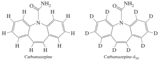 chromatographic analysis gave an apparent spike recovery of Deuterium (D) is the hydrogen isotope . Deuterated carbamazepine can be used as an internal standard for carbamazepine. The deuterated compound has the same retention time as undertreated material in chromatography, but is distinguished by its higher mass in the mass spectrum. When deuterated carbamazepine was used as an internal standard for the analysis, the apparent recovery was Explain how the internal standard is used in this analysis and rationalize why it works so well to correct for matrix effects.