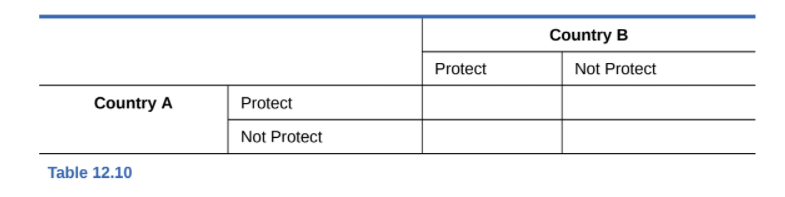 a. In Table 12.10, fill in the costs, benefits, and total payoffs to the countries of the following decisions. Explain why, without some international agreement, they are likely to end up with neither country acting to protect the