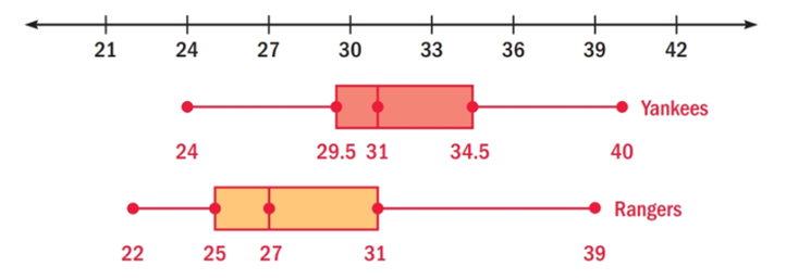 The box-and-whisker plots below show the ages of the players on the New York Yankees and the Texas Rangers baseball teams during the 2002 season.