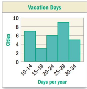 The histogram shows the average number of vacation days that working citizen in 30 major cities in Europe and North America have each year.