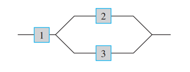 Consider a system consisting of three components as pictured. The system will continue to function as long as the first component functions and either component \({\rm{2}}\) or component \({\rm{3}}\)functions. Let \({{\rm{X}}_{{\rm{1,}}}}{{\rm{X}}_{\rm{2}}}\), and \({{\rm{X}}_{\rm{3}}}\) denote the lifetimes of components \({\rm{1}}\), \({\rm{2}}\), and \({\rm{3}}\), respectively. Suppose the \({{\rm{X}}_{\rm{i}}}\) ’s are independent of one another and each \({{\rm{X}}_{\rm{i}}}\) has an exponential distribution with parameter \({\rm{\lambda }}\).