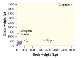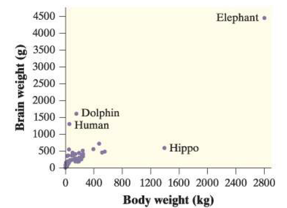 All brawn? The following scatterplot plots the average brain weight (in grams) versus average body weight (in kilograms) for species of mammals. There are many small mammals whose points overlap at the lower left.