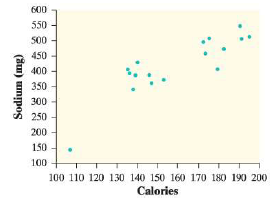 following scatterplot shows the calories and salt content (measured in milligrams of sodium) in brands of meat hot dogs.