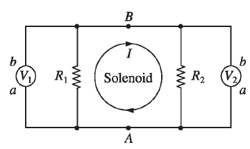 The current in a long solenoid is increasing linearly with time, so the flux is proportional :.Two voltmeters are connected to diametrically opposite points (A and B), together with resistors ( and ), as shown in Fig. 7.55. What is the reading on each voltmeter? Assume that these are ideal voltmeters that draw negligible current (they have huge internal resistance), and that a voltmeter register -between the terminals and through the meter. [Answer: . Notice that , even though they are connected to the same points]
