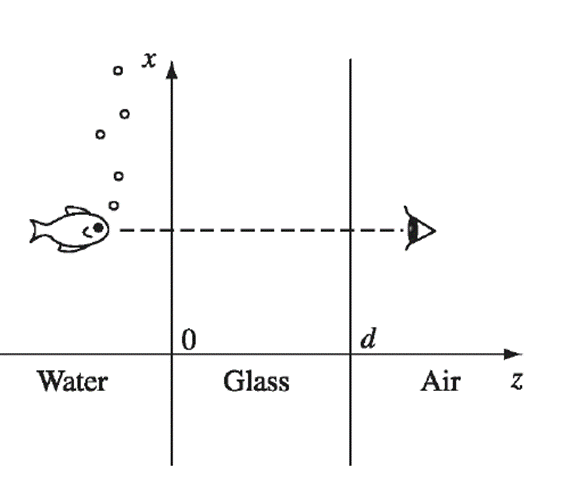 Light from an aquarium (Fig. 9.27) goes from water through a plane of glass into the air . Assuming it鈥檚 a monochromatic plane wave and that it strikes the glass at normal incidence, find the minimum and maximum transmission coefficients (Eq. 9.199). You can see the fish clearly; how well can it see you?