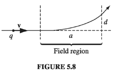 A particle of charge qenters a region of uniform magnetic field (pointing intothe page). The field deflects the particle a distanced above the original line of flight, as shown in Fig. 5.8. Is the charge positive or negative? In terms of a, d, Band q,find the momentum of the particle.
