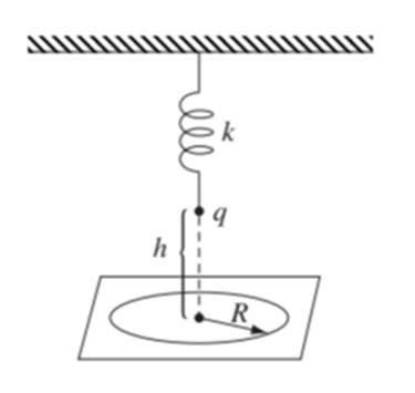A particle of mass m and charge q is attached to a spring with force constant k, hanging from the ceiling (Fig. 11.18). Its equilibrium position is a distance h above the floor. It is pulled down a distance d below equilibrium and released, at time.