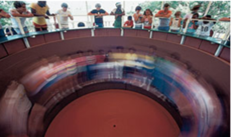 In a 鈥淩otor-ride鈥 at a carnival, people rotate in a vertical cylindrically walled 鈥渞oom.鈥 (See Fig. 5鈥47.) If the room radius is 5.5 m, and the rotation frequency 0.50 revolutions per second when the floor drops out, what minimum coefficient of static friction keeps the people from slipping down? People on this ride said they were 鈥減ressed against the wall.鈥 Is there really an outward force pressing them against the wall? If so, what is its source? If not, what is the proper description of their situation (besides nausea)?