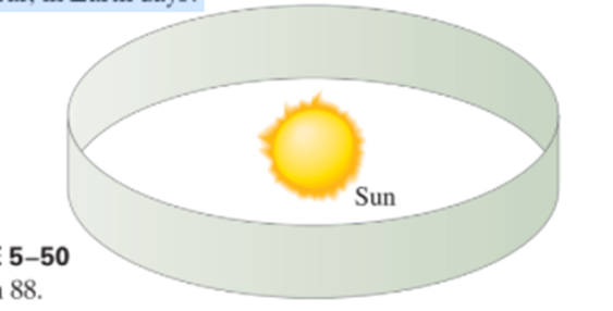 A science-fiction tale describes an artificial 鈥減lanet鈥 in the form of a band completely encircling a sun (Fig. 5鈥50). The inhabitants live on the inside surface (where it is always noon). Imagine that this sun is exactly like our own, that the distance to the band is the same as the Earth-Sun distance (to make the climate livable), and that the ring rotates quickly enough to produce an apparent gravity of gas on Earth. What will be the period of revolution, this planet鈥檚 year, in Earth days?