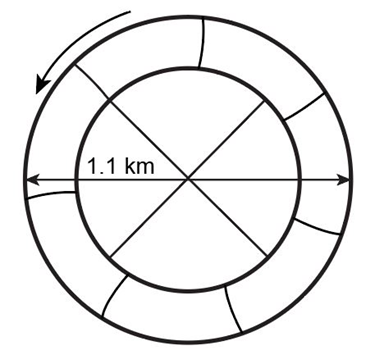A proposed space station consists of a circular tube that will rotate about its center (like a tubular bicycle tire), Fig. 5–39. The circle formed by the tube has a diameter of 1.1 km. What must be the rotation speed (revolutions per day) if an effect nearly equal to gravity at the surface of the Earth (say, 0.90 g) is to be felt?