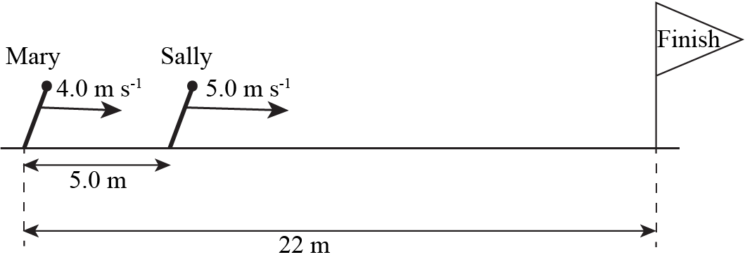Marry and Sally are in a foot race (See below figure). When Mary is 22 m from the finish line, she has a speed of and is 5 m behind Sally, who has a speed of . Sally thinks she has an easy win and so, during the remaining portion of the race, decelerates at a constant rate of to the finish line. What constant acceleration does Mary now need during the remaining portion of the race, if she wishes to cross the finish line side by side with Sally?