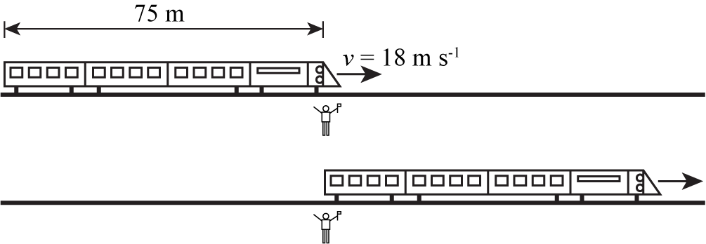A 75-m-long train begins uniform acceleration from rest. The front of the train has a speed of when it passes a railway worker who is standing 180 m from where the front of the train started. What will be the speed of the last car as it passes the worker? (See below figure)