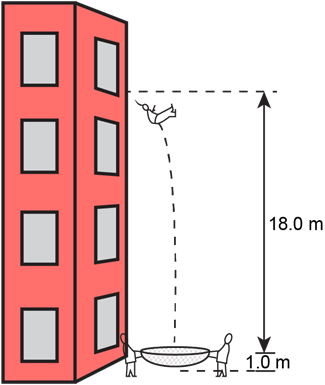 A person jumps out of the fourth-story window of a building18.0 m above a firefighter’s safety net. The survivor stretches the net 1.0 m before coming to rest (Fig. 2–45). (a) What is the average deceleration experienced by the survivor when she was slowed to rest by the net? (b) What would you do to make it ’safer’ (that is, to generate a smaller deceleration)? Would you stiffen or loosen the net? Explain.