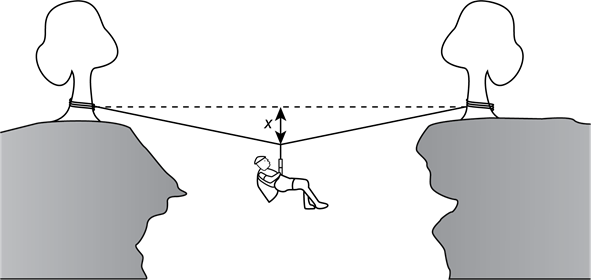 Bob traverses a chasm by stringing a rope between a tree on one side of the chasm and a tree on the opposite side, 25 m away, Fig. 4-65. Assume the rope can provide a tension force up to 29 KN before breaking, and use a 鈥渟afety factor鈥 of 10 (that is, the rope should only be required to undergo a tension force of 2.9 kN). (a) If Bob鈥檚 mass is 72.0 kg, determine the distance x that the rope must sag at a point halfway across if it is to be within its recommended safety range. (b) If the rope sags by only one-fourth the distance found in (a), determine the tension force in the rope. Will the rope break?