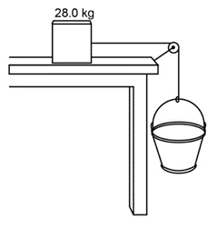 A 28.0-kg block is connected to an empty 2.00-kg bucket by a cord running over a frictionless pulley (Fig. 4鈥73). The coefficient of static friction between the table and the block is 0.45 and the coefficient of kinetic friction between the table and the block is 0.32. Sand is gradually added to the bucket until the system just begins to move. (a) Calculate the mass of sand added to the bucket. (b) Calculate the acceleration of the system. Ignore mass of cord.