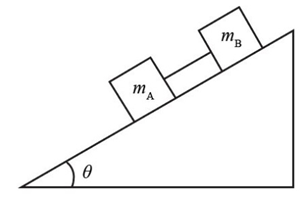 Two blocks made of different materials, connected by a thin cord, slide down a plane ramp inclined at an angleto the horizontal, Fig. 4鈥76 (block B is above block A). The masses of the blocks areand, and the coefficients of friction areand. Ifandand, determine (a) the acceleration of the blocks and (b) the tension in the cord, for an angle.