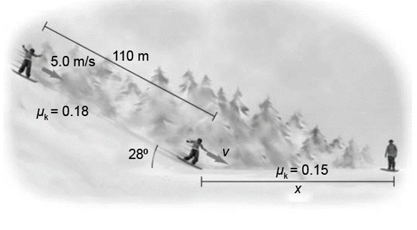 A 75-kg snowboarder has an initial velocity of at the top of a 28掳 incline (Fig. 4鈥75). After sliding down the 110-m-long incline (on which the coefficient of kinetic friction is), the snowboarder has attained a velocity v. The snowboarder then slides along a flat surface (on which) and comes to rest after a distance x. Use Newton鈥檚 second law to find the snowboarder鈥檚 acceleration while on the incline and while on the flat surface. Then use these accelerations to determine x.