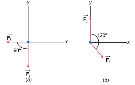 The two forcesand, as shown in Fig. 4–52 (a) and (b), (looking down) act on an 18.5 kg object on a frictionless tabletop. If,and, find the net force on the object and its acceleration for (a) and (b).