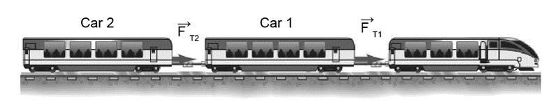 A train locomotive is pulling two cars of the same mass behind it (Fig. 4–51). Determine the ratio of the tension in the coupling (think of it as a cord) between the locomotive and the first carto that between the first car and the second carfor any non-zero acceleration of the train.