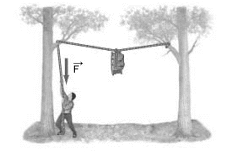 A bear sling (Fig. 4-40) is used in some national parks for placing backpackers’ food out of the reach of bears. As a backpacker raises the pack by pulling down on the rope, the force F needed