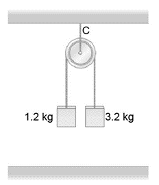 Suppose the pulley in Fig. 4–55 is suspended by a cord C. Determine the tension in this cord after the masses are released and before one hits the ground. Ignore the masses of the pulley and cords.