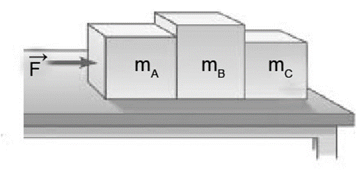 Three blocks on a frictionless horizontal surface are in contact with each other, as shown in Fig. 4–54. A forceis applied to block A (mass mA). (a) Draw a free-body diagram for each block. Determine (b) the acceleration of the system (in terms of mA, mB, and mC), (c) the net force on each block, and (d) the force of contact that each block exerts on its neighbor. (e) If,and,give numerical answers for (b), (c), and (d). Explain how your answers make sense intuitively.