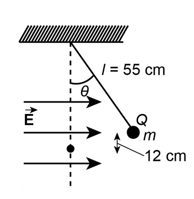 A point charge \(\left( {m = 1.0 gram} \right)\) at the end of an insulating cord of length 55 cm is observed to be in equilibrium in a uniform horizontal electric field of \(9500 N/C\), when the pendulum’s position is as shown in Fig. 16–66, with the charge 12 cm above the lowest (vertical) position. If the field points to the right in Fig. 16–66, determine the magnitude and sign of the point charge.