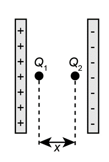 Question:Two point charges,\({Q_1} = - 6.7{\rm{ }}\mu {\bf{C}}\) and\({Q_2} = {\bf{1}}{\bf{.8 }}\mu {\bf{C}}\)are located between two oppositely charged parallel plates, as shown in Fig. 16–65. The two charges are separated by a distance of \(x = 0.47 m\). Assume that the electric field produced by the charged plates is uniform and equal to\(E = 53,000 N/C\). Calculate the net electrostatic force on\({Q_1}\) and give its direction.
