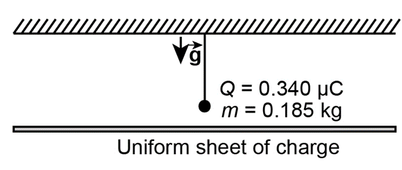 A point charge of mass 0.185 kg, and net charge\( + {\bf{0}}{\bf{.340 }}\mu {\bf{C}}\)hangs at rest at the end of an insulating cord above a large sheet of charge. The horizontal sheet of fixed uniform charge creates a uniform vertical electric field in the vicinity of the point charge. The tension in the cord is measured to be 5.18 N. Calculate the magnitude and direction of the electric field due to the sheet of charge (Fig. 16鈥67).