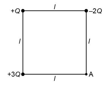 (II) Three point charges are arranged at the corners of a square of side l as shown in Fig. 17鈥39. What is the potential at the fourth corner (point A)?