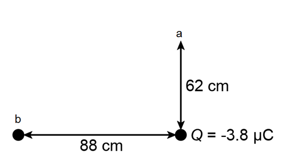 (II) Point a is 62 cm north of a \( - {\bf{3}}{\bf{.8}}\;{\bf{\mu C}}\) point charge, and point b is 88 cm west of the charge (Fig. 17鈥40). Determine (a) \({{\bf{V}}_{\bf{b}}} - {{\bf{V}}_{\bf{a}}}\) and (b) \({{\bf{\vec E}}_{\bf{b}}} - {{\bf{\vec E}}_{\bf{a}}}\) (magnitude and direction).
