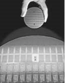 FIGURE 1-17 Problem 41. The wafer held by the hand is shown below, enlarged and illuminated by colored light. Visible are rows of integrated circuits (chips).