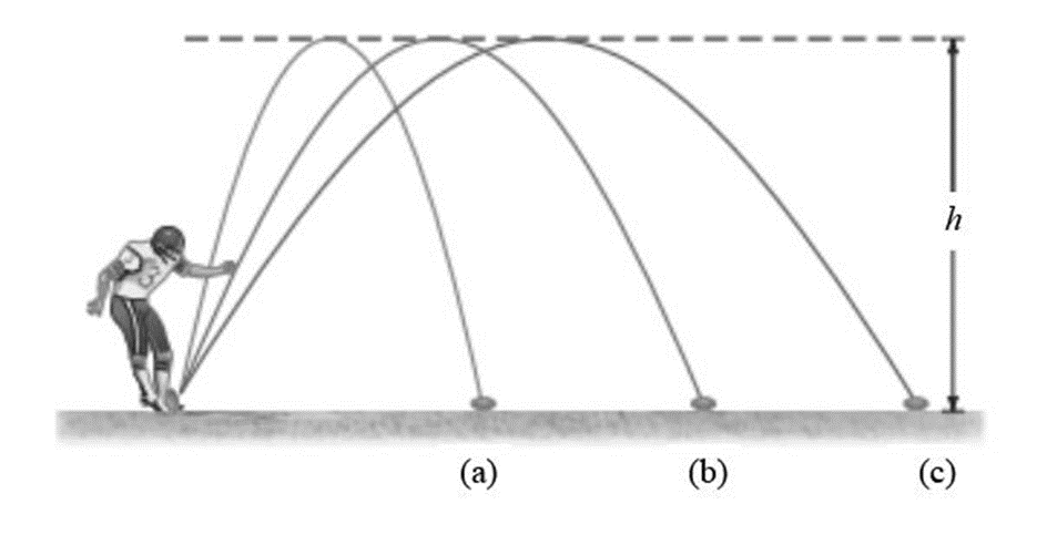 Which of the three kicks in Fig. 3-32 is in the air for the longest time if they all reach the same maximum height h. Ignore the air resistance.