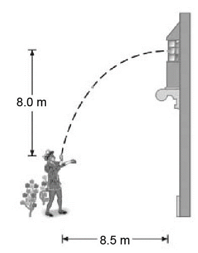 Romeo is throwing pebbles gently up to Juliet’s window, and he wants the pebbles to hit the window with only a horizontal component of velocity. He is standing at the edge of a rose garden 8.0 m below her window and 8.5 m from the base of the wall (Fig. 3-49). How fast are the pebbles going when they hit her window?