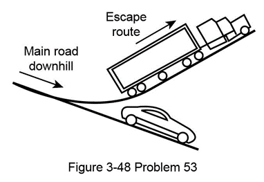 On mountainous downhill roads, escape routes are sometimes placed to the side of the road for trucks whose brakes might fail. Assuming a constant upward slope of, calculate the horizontal and vertical components of the acceleration of a truck that slowed from 110 km/h to rest in 7.0 s. See Fig. 3-48.