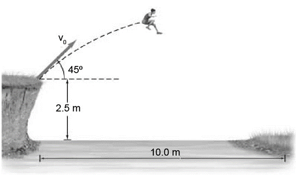 A long jumper leaves the ground atabove the horizontal plane and lands 8.0 m away. What is her ‘takeoff’ speed? (b) Now she is out on a kike and comes to the left bank of the river. There is no bridge, and the right bank is 10.0 m away horizontally and 2.5 m below vertically. If she long jumps from the edge of the left bank atwith the speed calculated, (a) how long or short of the opposite bank will she land?