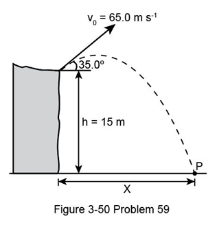 A projectile is shot from the edge of a cliff 115 m above ground level with an initial speed of 65.0 m/s at an angle ofwith the horizontal plane, as shown in Fig, 3-51. (a) Determine the time taken by the projectile to hit point P at ground level. (b) Determine the distance X of point P from the base of the vertical cliff. At the instant just before the projectile hits point P, find (c) the horizontal and the vertical components of its velocity, (d) the magnitude of the velocity, and (e) the angle made by the velocity vector with the horizontal. (f) Find the maximum height above the cliff top reached by the projectile.