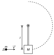 A pendulum consists of a mass M hanging at the bottom end of a massless rod of length l which has a frictionless pivot at its top end. A mass m, moving as shown in Fig. 7–35 with velocity v, impacts M and becomes embedded. What is the smallest value of v sufficient to cause the pendulum (with embedded mass m) to swing clear over the top of its arc?