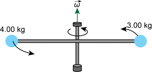 A 4.00-kg mass and a 3.00-kg mass are attached to opposite ends of a very light 42.0-cm-long horizontal rod (Fig. 8鈥61). The system is rotating at angular speed\(\omega = 5.60\;{\rm{rad/s}}\)about a vertical axle at the center of the rod. Determine (a) the kinetic energy KE of the system, and (b) the net force on each mass.