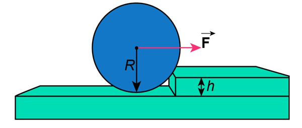 A wheel of mass M has radius R. It is standing vertically on the floor, and we want to exert a horizontal force F at its axle so that it will climb a step against which it rests (Fig. 8鈥60). The step has height h, where h < R. What minimum force F is needed?