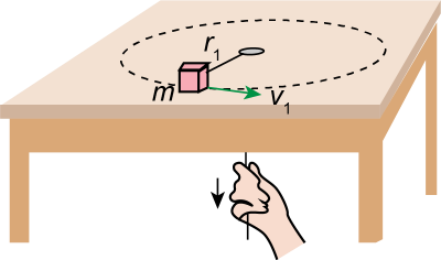 A small mass m attached to the end of a string revolves in a circle on a frictionless table top. The other end of the string passes through a hole in the table (Fig. 8鈥62). Initially, the mass revolves with a speed\({v_1} = 2.4\;{\rm{m/s}}\)in a circle of radius\({r_1} = 0.80\;{\rm{m}}\). The string is then pulled slowly through the hole so that the radius is reduced to\({r_2} = 0.48\;{\rm{m}}\). What is the speed,\({v_2}\), of the mass now?