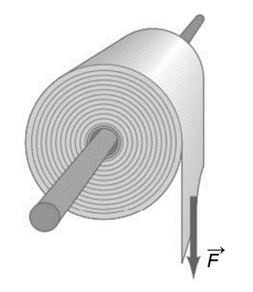 The radius of the roll of paper shown in Fig. 8鈥67 is 7.6 cm and its moment of inertia is \(I = 3.3 \times {10^{ - 3}}\;{\rm{kg}} \cdot {{\rm{m}}^2}\). A force of 3.5 N is exerted on the end of the roll for 1.3 s, but the paper does not tear so it begins to unroll. A constant friction torque of \(I = 0.11\;{\rm{m}} \cdot {\rm{N}}\) is exerted on the roll which gradually brings it to a stop. Assuming that the paper鈥檚 thickness is negligible, calculate (a) the length of paper that unrolls during the time that the force is applied (1.3 s) and (b) the length of paper that unrolls from the time the force ends to the time when the roll has stopped moving