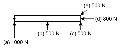 The solid dot shown in Fig. 8–36 is a pivot point. The board can rotate about the pivot. Which force shown exerts the largest magnitude torque on the board?