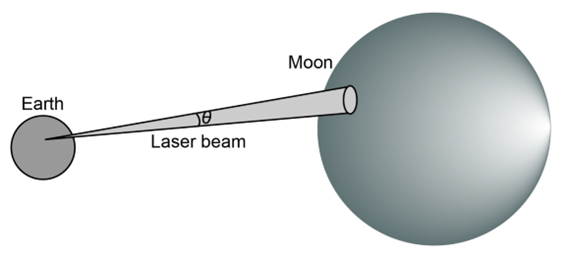 A laser beam is directed at the Moon, 380,000 km from Earth. The beam diverges at an angle \({\bf{\theta }}\) (Fig. 8–40) of \({\bf{1}}{\bf{.4 \times 1}}{{\bf{0}}^{{\bf{ - 5}}}}\;{\bf{rad}}\). What diameter spot will it make on the Moon?