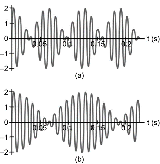 Consider the two waves shown in Fig. 12鈥31. Each wave can be thought of as a superposition of two sound waves with slightly different frequencies, as in Fig. 12鈥18. In which of the waves, (a) or (b), are the two component frequencies farther apart? Explain.
