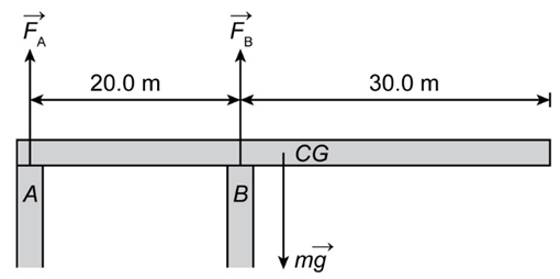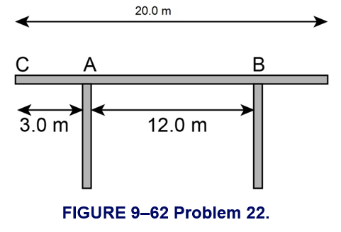 A 20.0-m-long uniform beam weighing 650 N rests on walls A and B, as shown in Fig. 9鈥62. (a) Find the maximum weight of a person who can walk to the extreme end D without tipping the beam. Find the forces that the walls A and B exert on the beam when the person is standing: (b) at D; (c) 2.0 m to the right of A.