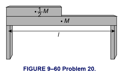 (II) A uniform steel beam has a mass of 940 kg. On it is resting half of an identical beam, as shown in Fig. 9鈥60. What is the vertical support force at each end?